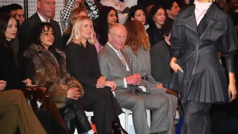 وارتدى تشارلز بدلة رمادية أنيقة بصف أزرار واحد مع قميص أبيض وربطة عنق منقوشة، وجلس إلى جانب المصممة البريطانية الشهيرة ستيلا مكارتني، والرئيسة التنفيذية للمجلس البريطاني للأزياء لورا وير.